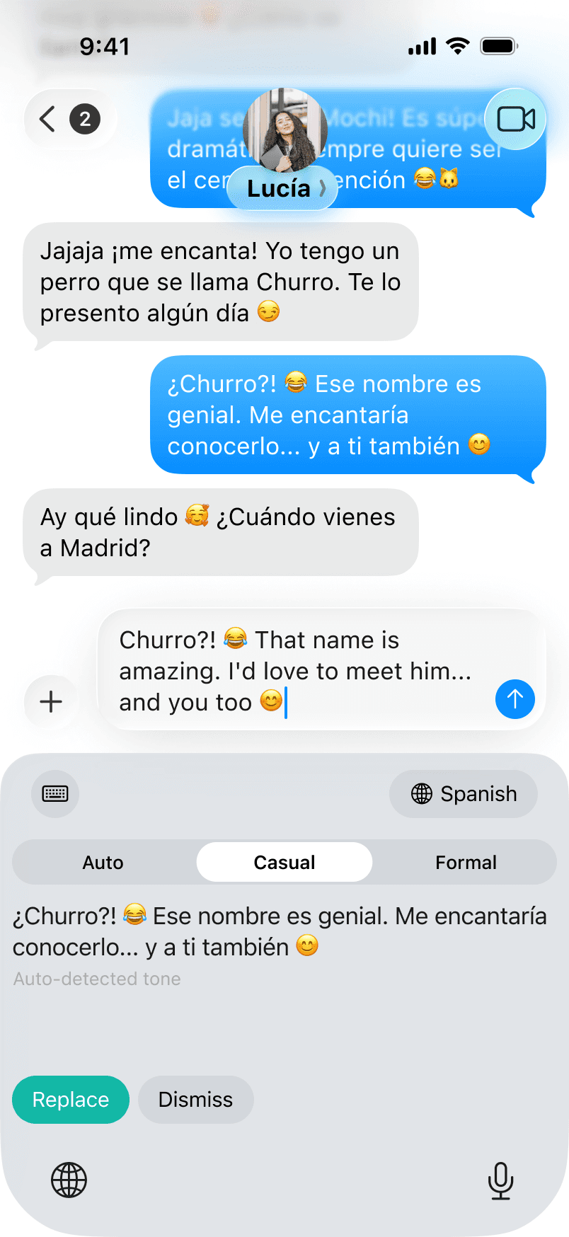 WhatsApp, iMessage, Instagram, Telegram, Slack, email — any app where you can type. Traduco is a keyboard, not another app to switch to.